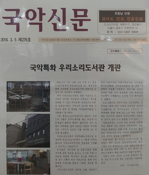 2017³â 12¿ù 14ÀÏ ¿ì¸®¼Ò¸®µµ¼°ü °³°ü. ±¹¾Ç µµ¼¡¤À½¹Ý ¿¶÷¡¤°¨»ó °¡´É. ÁÖ¼Ò: ¼¿ï½Ã Á¾·Î±¸ Àͼ±µ¿ 99¹øÁö 4~5Ãþ.